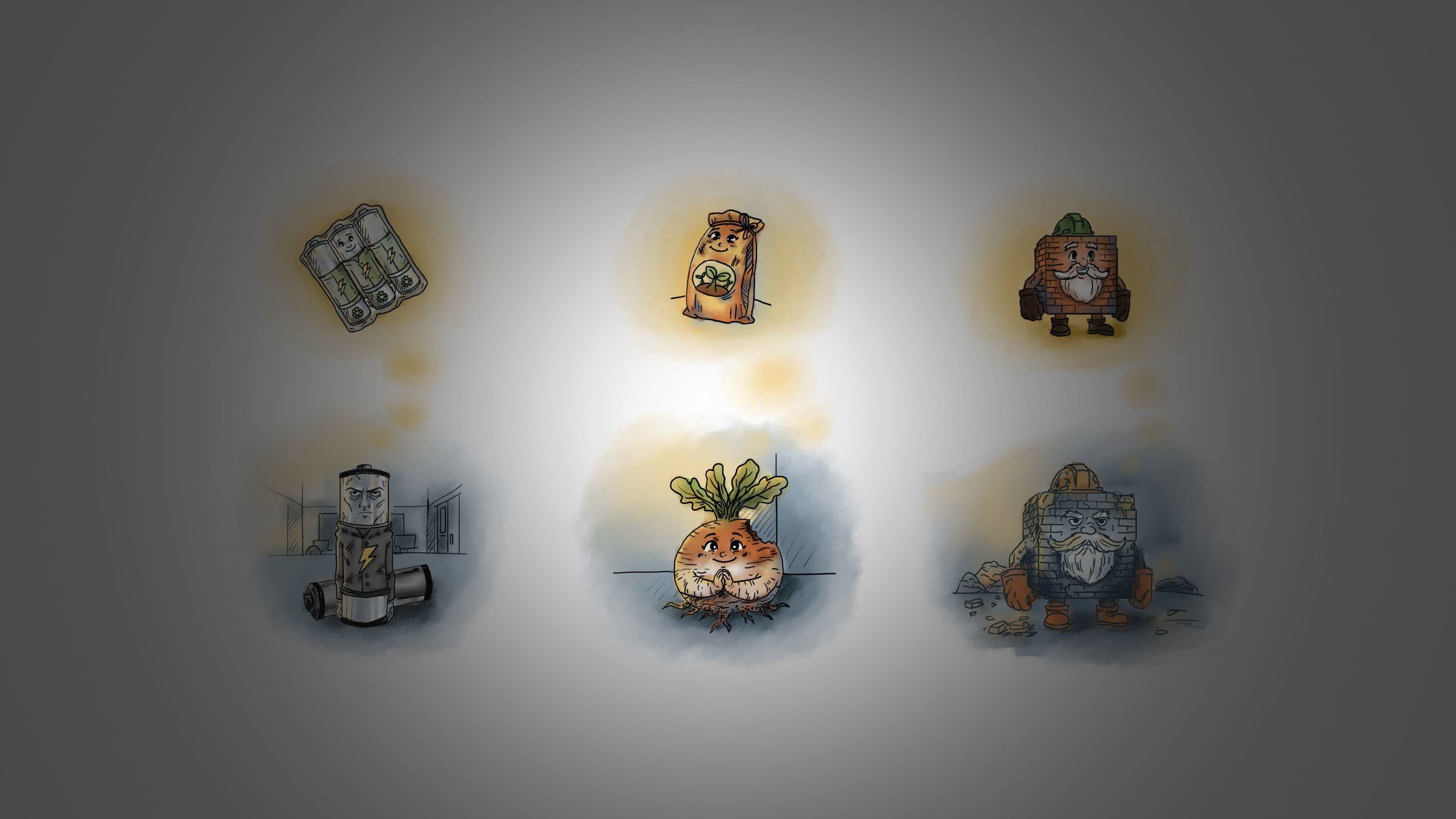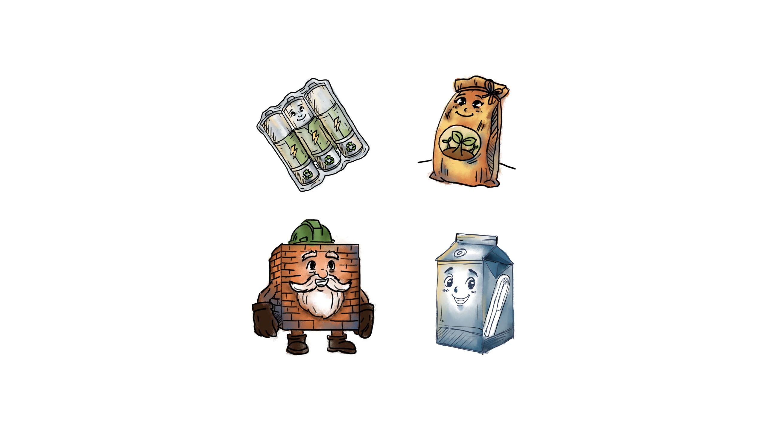 Hộp Sữa và Viên Gạch phấn khích khi chuẩn bị được tái chế thành vật liệu hữu ích cho con người. Mẩu Củ Cải mong muốn được ủ thành phân compost nuôi cây, trong khi Cục Pin chỉ cần xử lý đúng cách để ngăn ngừa chất độc hại thải ra môi trường.