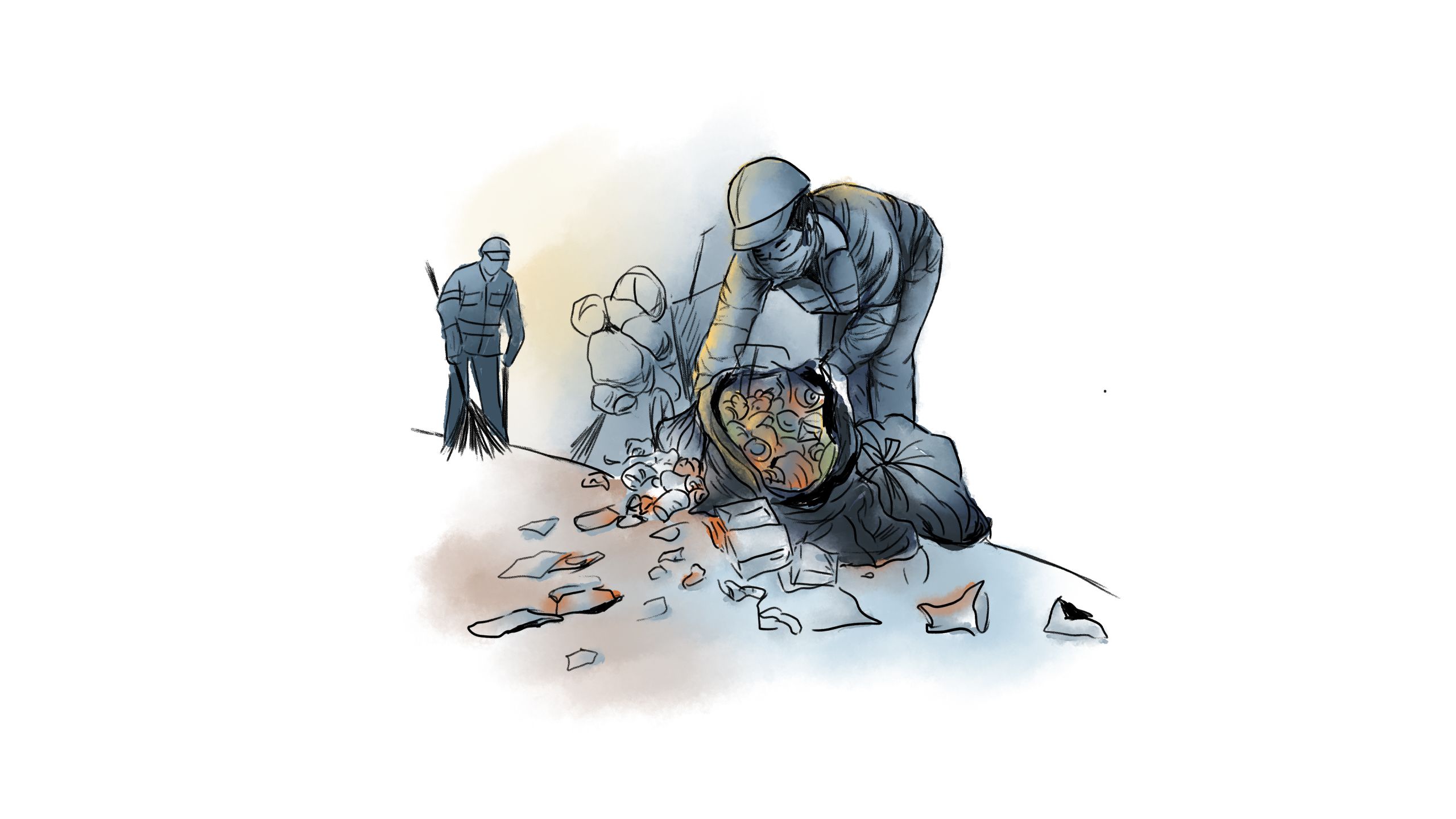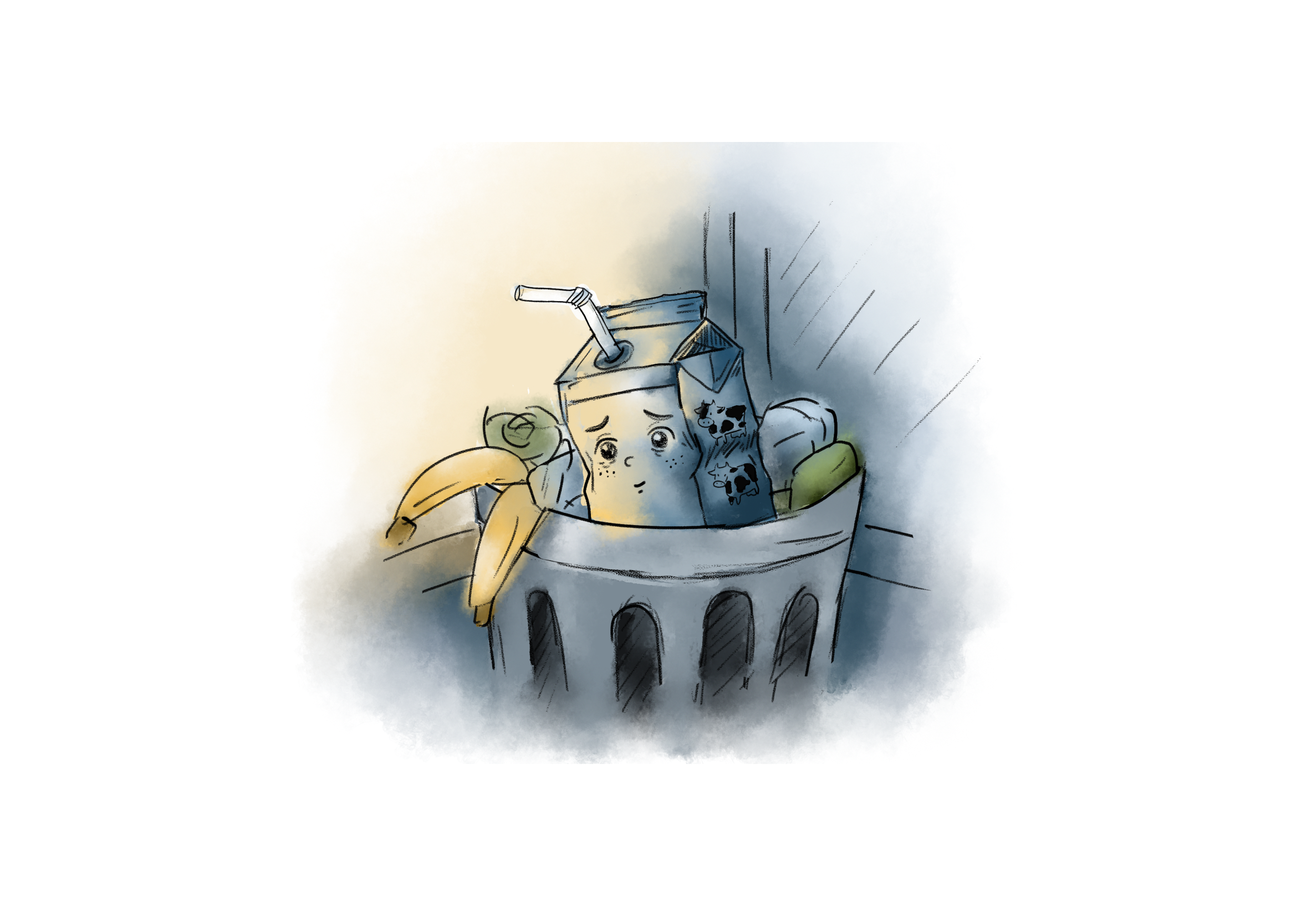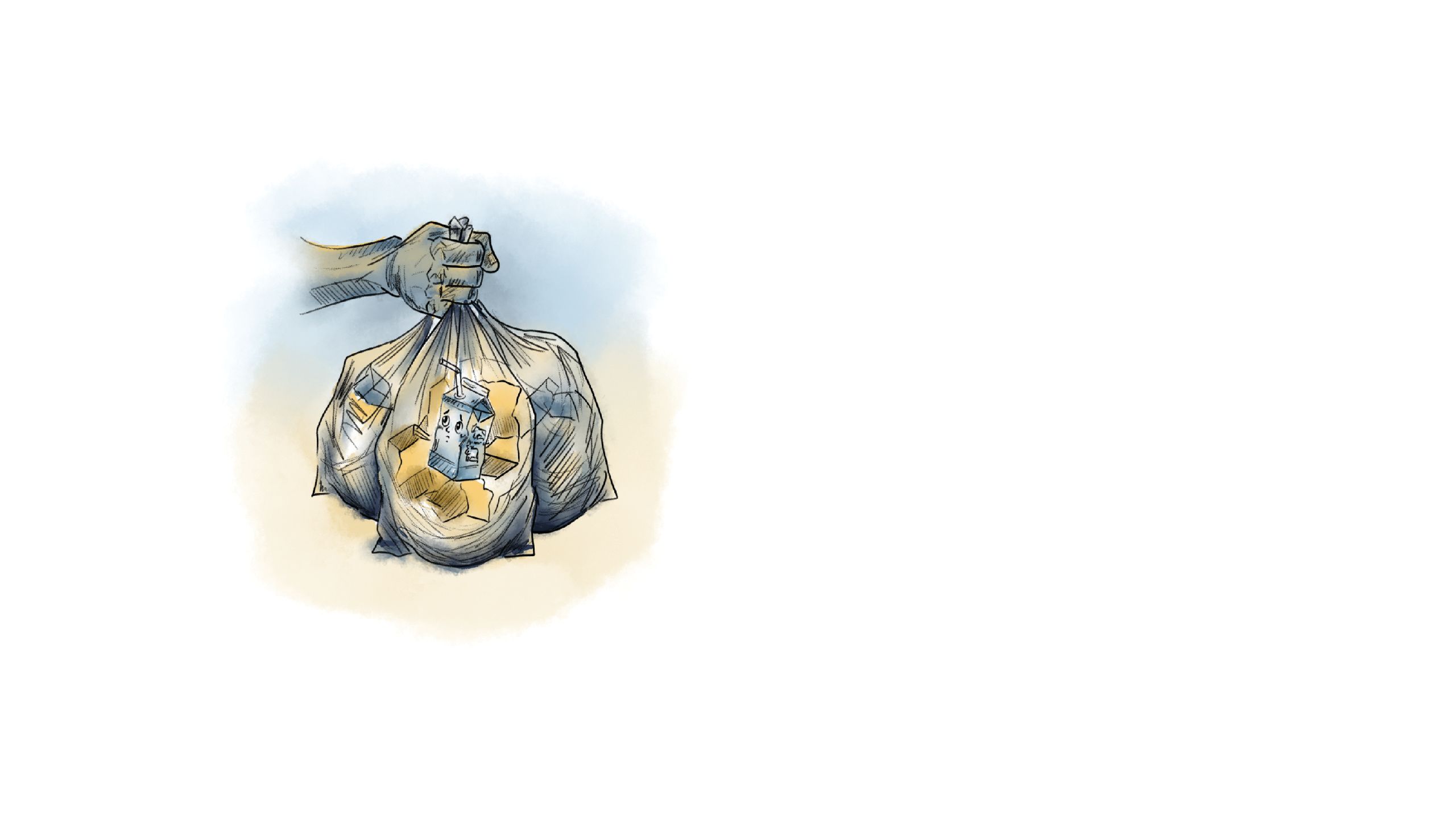 Sáu giờ chiều, túi rác được mang ra điểm tập kết chung ở đầu ngõ, nơi ánh sáng cuối ngày len lỏi qua dòng xe cộ tấp nập. Xuyên qua lớp nylon mỏng, Hộp Sữa hé mắt nhìn thấy bóng dáng của người công nhân vệ sinh môi trường đang tiến lại gần. Với thao tác quen thuộc, người lao công mở từng chiếc túi, nhanh tay nhặt riêng những vật liệu có giá trị. Hộp Sữa cùng những người bạn nín thở dõi theo, hy vọng mình được chú ý. Song, chúng hoàn toàn bị phớt lờ, hụt hẫng nhìn từng chiếc vỏ lon, tấm bìa carton, chai nhựa được lựa chọn để phân loại.